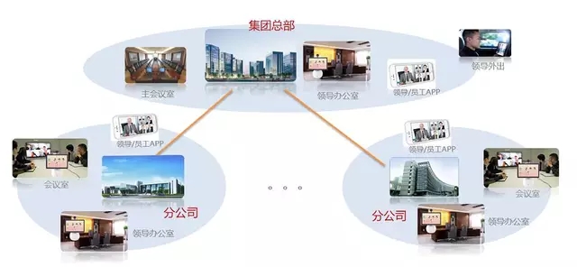 針對上述需求,公司為大中型企業提供了綜合的解決方案,該視頻會議系統運行在企業專網或者互聯網上。視頻會議多點控制器架設在企業總部中心機房,在公司總部會議室和分公司會議室進行視頻會議系統以及外圍設備的架設,在公司領導電腦上安裝軟件視頻會議終端,公司總部和分公司可以通過這套視頻會議系統進行召開內部會議、傳達產品介紹、銷售活動、員工培訓等,在分公司多個終端用戶會議室和電腦上安裝直播客戶端,可以隨時接收會議指示以及培訓的內容,進行聲音、圖像、文檔的傳輸。